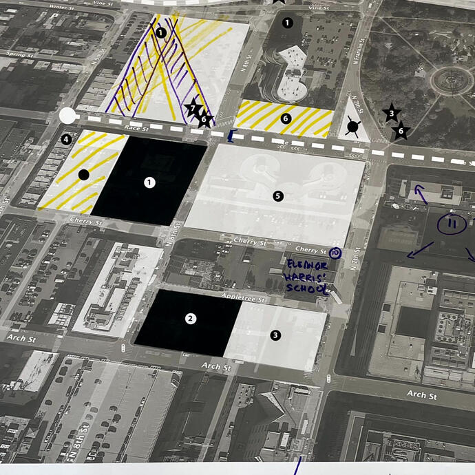 Partner: Creative Development PartnersIn Philadelphia, the area between Chinatown and the Historic District provides vehicular access to a highway and bridge. Sojourner and its partner Creative Development Partners facilitated a visioning process for local stakeholders, including African American Museum of Philadelphia and Historic Philadelphia. Stakeholders and guest advisors envisioned how to fill the gap with community-driven uses.The resulting concept plan sets out strategies to 1, 2, 3.